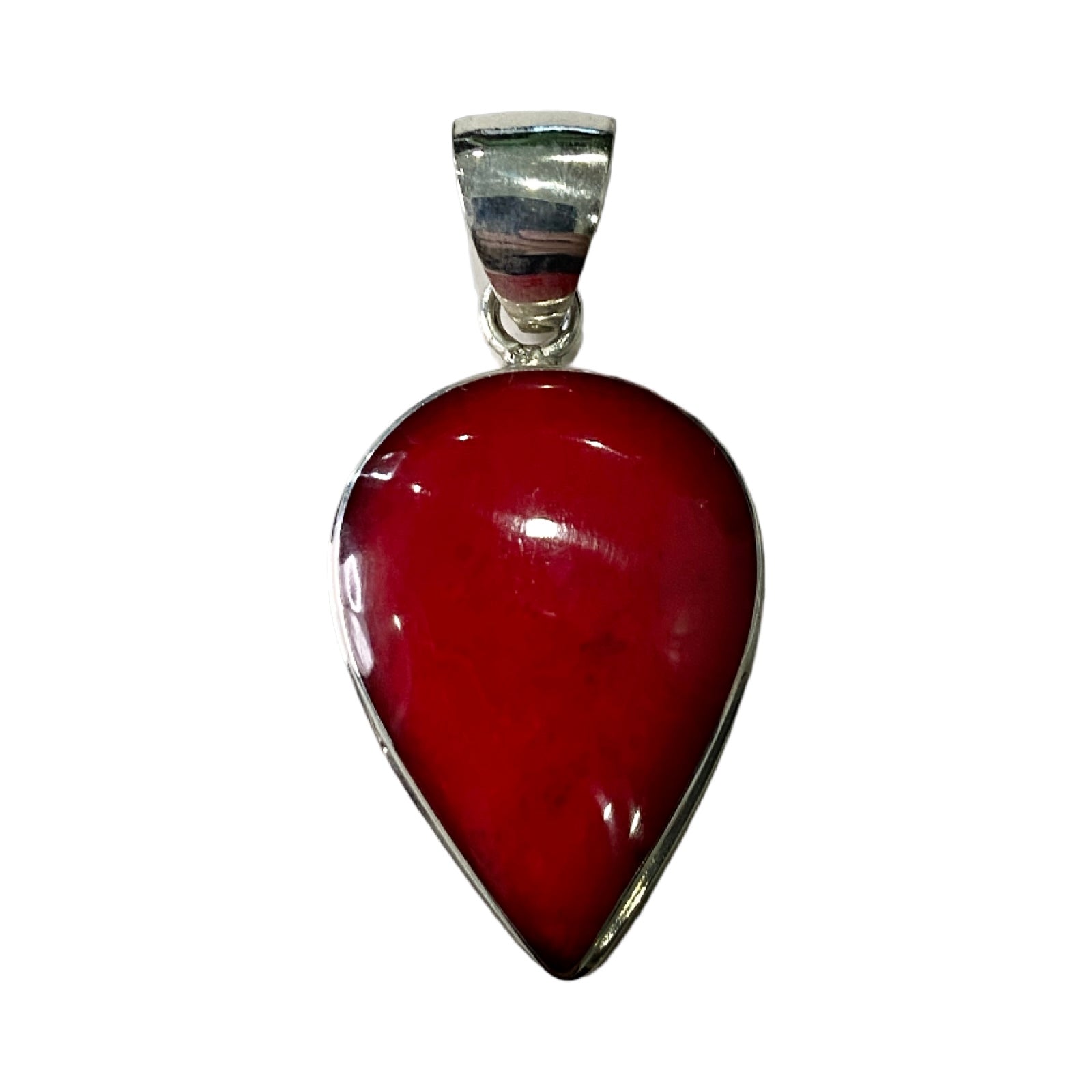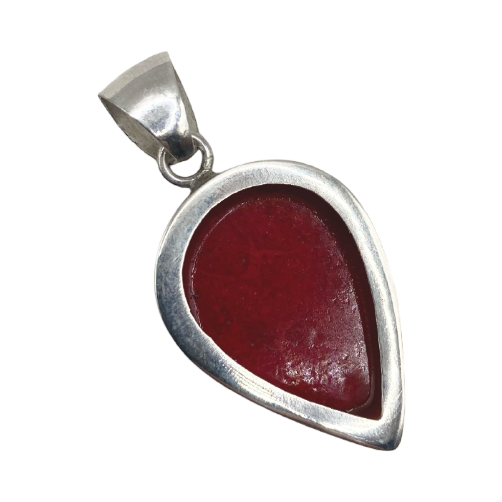 This striking teardrop-shaped pendant features a bold, polished red gemstone set in a sleek sterling silver bezel. The vibrant red... Read more